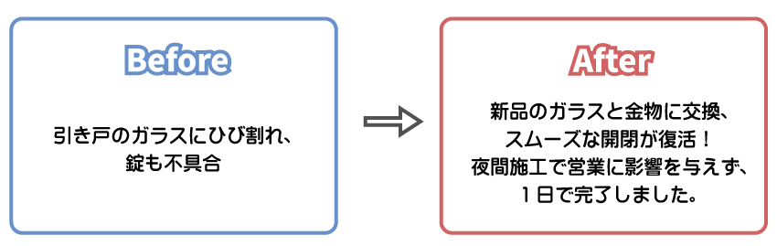「ガラスが割れてしまった」「鍵の動きが悪い」——そんな店舗からのご相談。