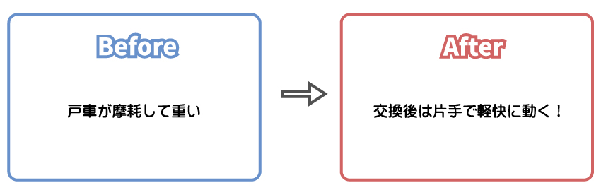調べてみると 戸車の劣化 が原因。部品交換のみで解決しましたが、お客様より、ご自身で交換できるか不安とのことでしたので、出張対応で取り換えさせていただきました。