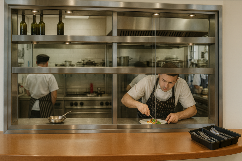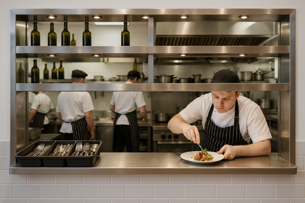 つまり、配膳カウンターは “料理を渡す場所” であると同時に、厨房の衛生を守るバリア機能を担う設備 なのです。