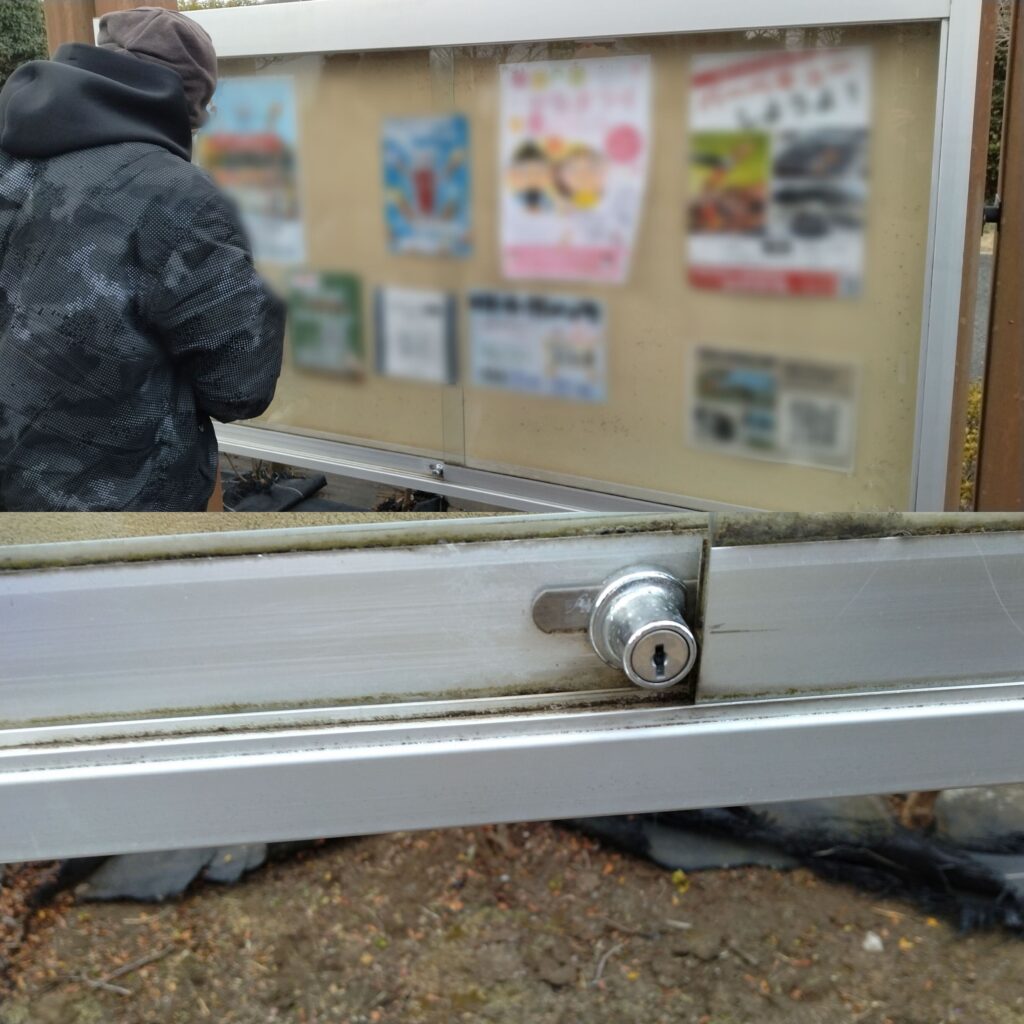 屋外掲示板は、公園やマンション、警察署、消防署、市役所、学校、お寺、幼稚園、保育園、自治会、町内会などにて使われていますが、開閉頻度が多いため戸車(ベアリング)の摩耗やカギ(プッシュ錠)が壊れたり、ガラスが割れたり、欠けたりと思わぬトラブルも出てくると思います。しかしながら実際にそのような場面に直面したときにどこに頼んで良いか分からないというお声も耳にします。