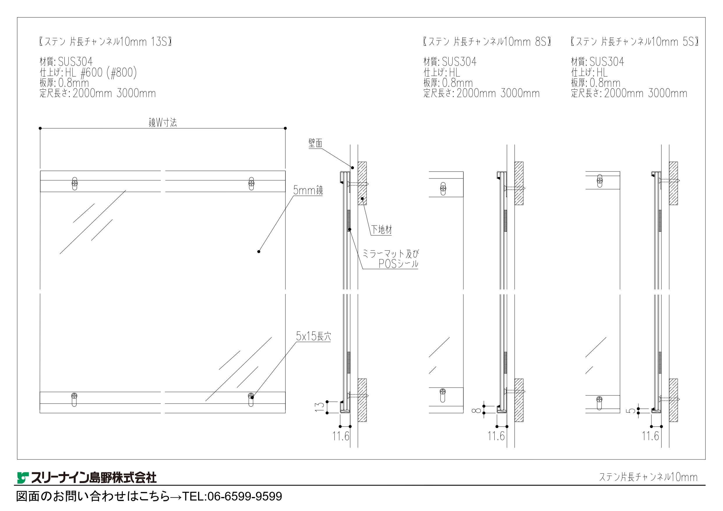 SUS304材にヘアライン/#600/#800仕上げを施し、5mm/6mm厚の鏡に対応します。