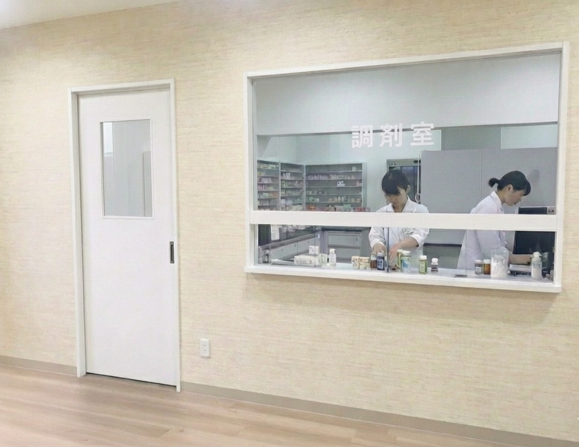 薬局・ドラッグストア・病院の調剤室に必要な透視面(窓口)を想定して設計された、調剤室用ガラス窓ユニットです。薬機法の考え方に配慮した既製品サイズとし、化粧枠付きの窓として一体化することで、窓まわりの仕様検討や部材手配の分散を抑え、図面を配置するだけで納まりやすい設計を実現しています。西日本・東日本の自治体基準を参考に既製品化しており、サイズやタイプの組み合わせによって、自治体ごとに異なる調剤室基準にも対応しやすい構成です。図面データを活用することで、細かな納まり検討や作図作業の工数を軽減し、設計・施工にかかる負担を効率的に抑えることができます。化粧枠・ガラス・引き戸機構をまとめた窓ユニットとすることで、従来は外注していた工程や手配を整理しやすくなり、設計から施工までの流れをシンプルに統一できます。FIX窓・らんま付引き戸窓・引き戸窓の3タイプを用意しており、調剤室のレイアウトや運用方法に応じた選定が可能です。