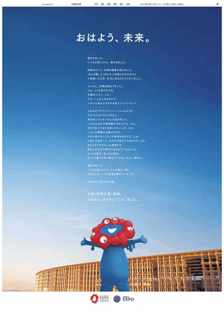 万博も遺すという事ではなく、この経験をどう未来に活かして行くかということを、もっと報道でも伝えるべきではないかと思っていました。そんなとき、今日の日経新聞を見ていて、載っていた一面広告は、ミャクミャクの言葉でした。